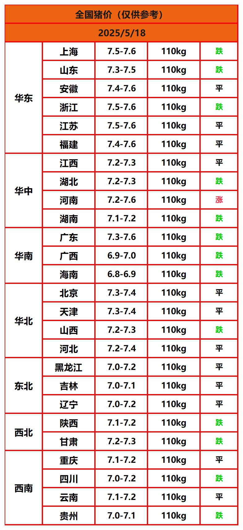 2025年5月18日猪价,今日全国猪价行情走势:1涨12平13跌。
