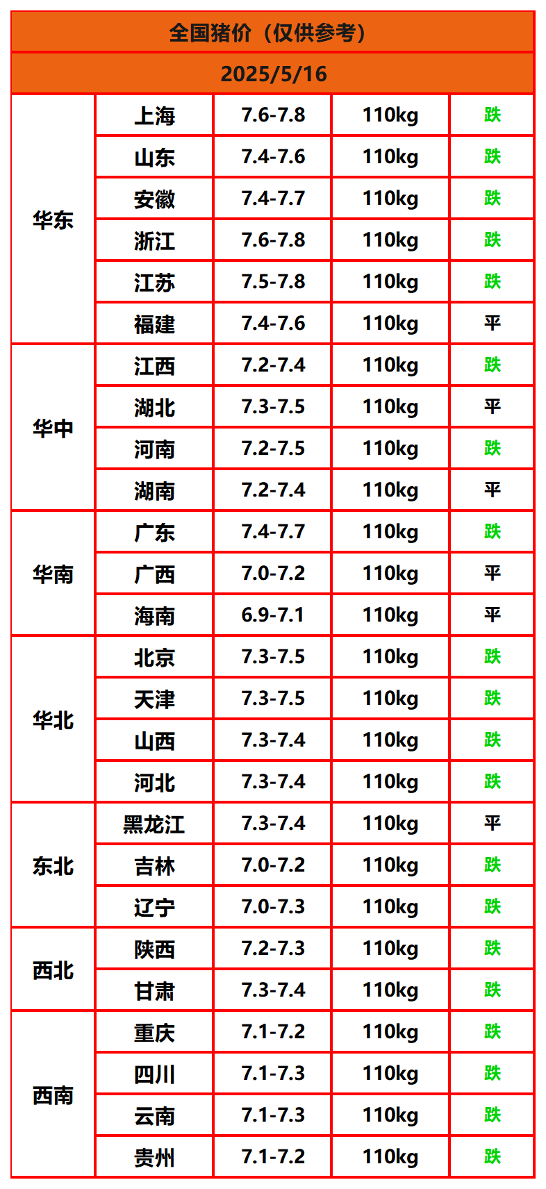 2025年5月16日猪价,今日全国猪价行情走势:0涨6平20跌。