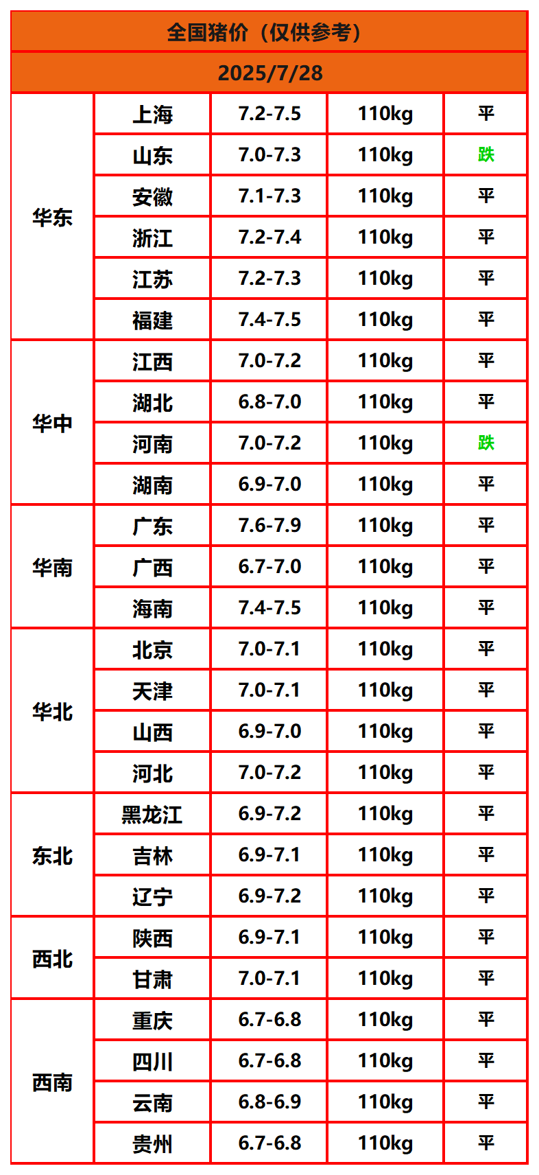 2025年7月28日猪价,今日全国猪价行情走势:0涨24平2跌。