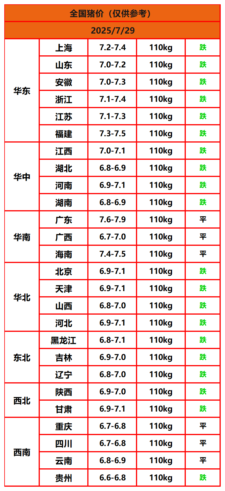 2025年7月29日猪价,今日全国猪价行情走势:0涨6平20跌。