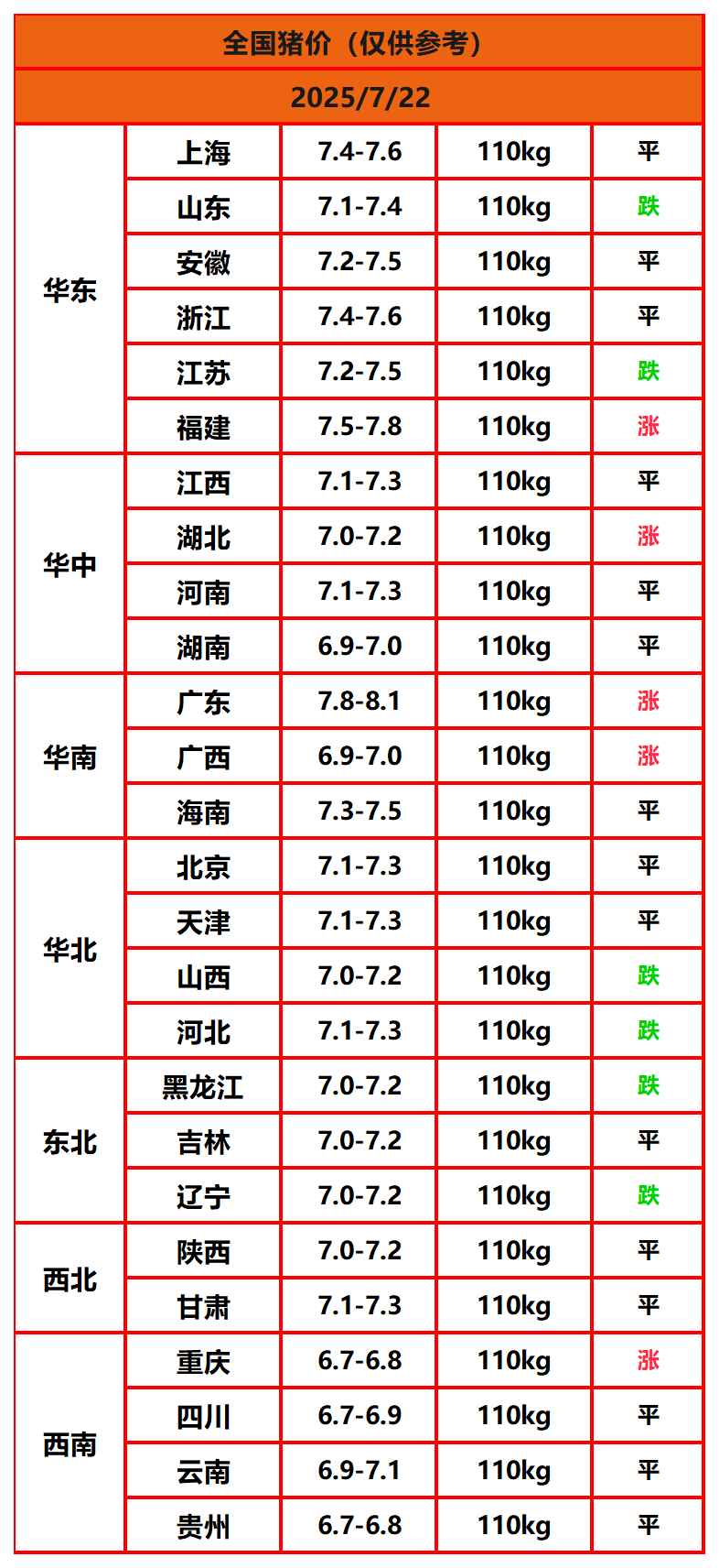 2025年7月22日猪价,今日全国猪价行情走势:5涨15平6跌。