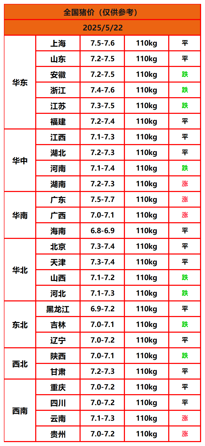 2025年5月22日猪价,今日全国猪价行情走势:5涨13平8跌。
