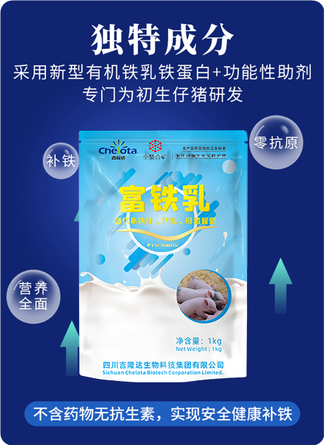 富铁乳 能够代替补铁针,增强教槽料效果和适口性,能可以强力预防仔猪血亏、僵猪,降低料肉比,改善仔猪皮毛。